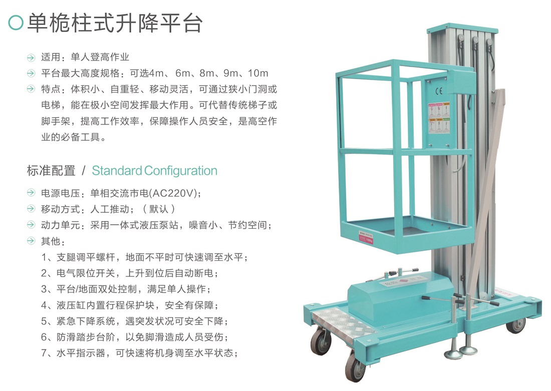 特點:體積小、自重輕、移動靈活,可通過狹小門洞或電梯,能在極小空間發揮最大作用。可代替傳統梯子或腳手架,提高工作效率,保障操作人員安全,是高空作業的必備工具。