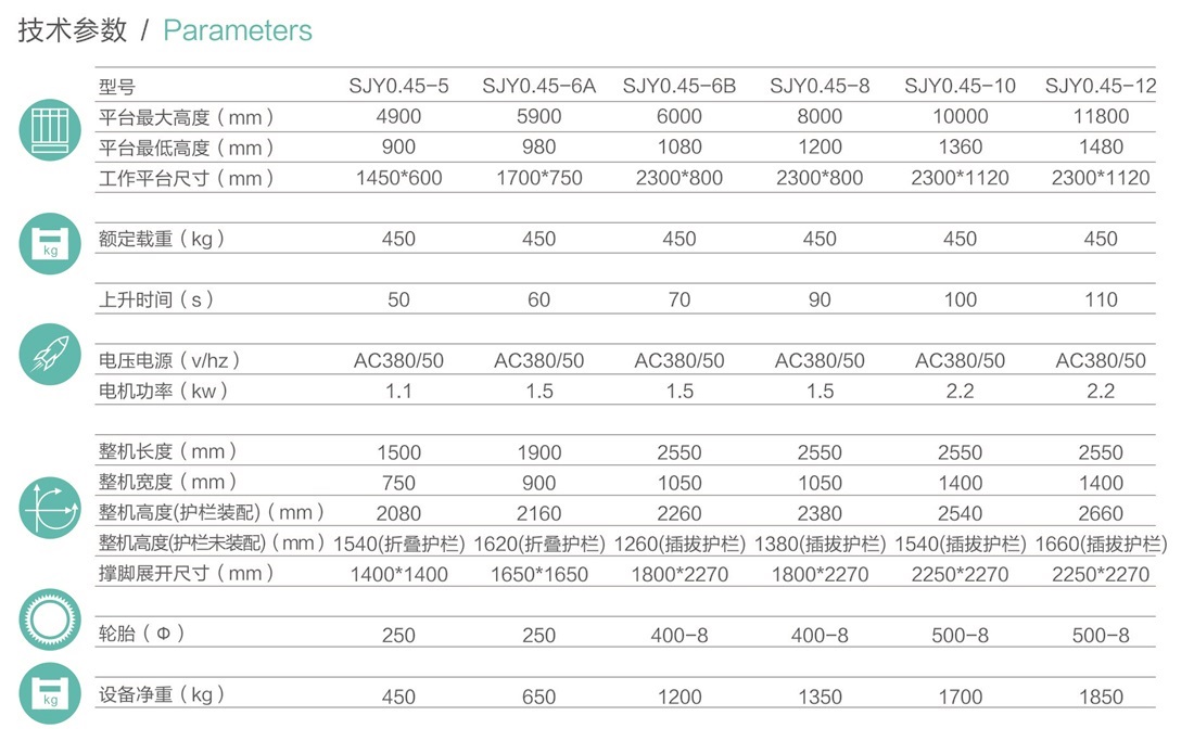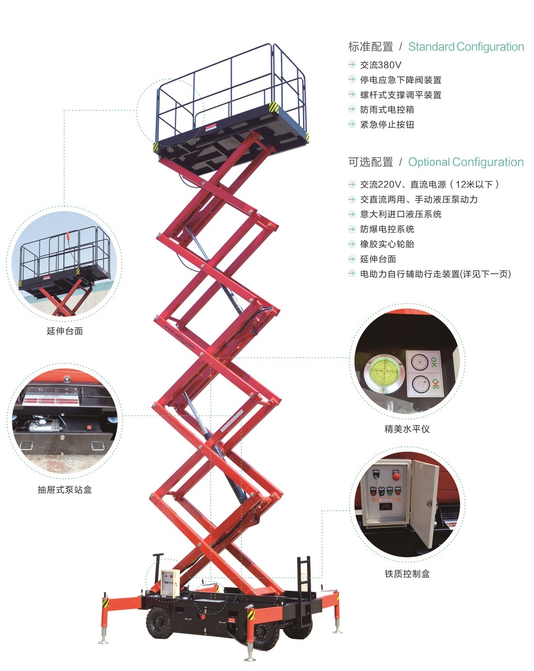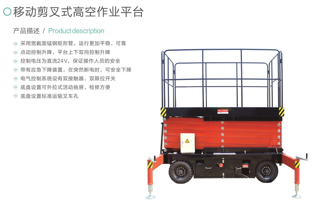 采用寬截面錳鋼矩形管,運行更加平穩、可靠點動控制升降,平臺上下雙向控制升降控制電壓為直流24V,保證操作人員的安全帶有應急下降裝置,在突然斷電時,可安全下降電氣控制系統設有雙接觸器、雙限位開關,底盤設置可外拉式活動抽屜,檢修方便,底盤設置標準運輸叉車孔