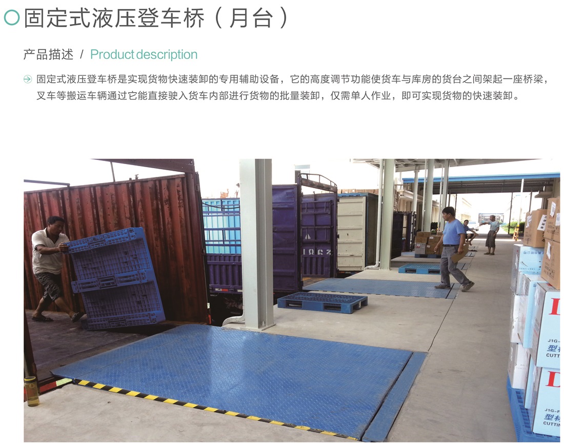 固定式液壓登車橋是實(shí)現(xiàn)貨物快速裝卸的專用輔助設(shè)備,它的高度調(diào)節(jié)功能使貨車與庫(kù)房的貨臺(tái)之間架起一座橋梁,叉車等搬運(yùn)車輛通過(guò)它能直接駛?cè)胴涇噧?nèi)部進(jìn)行貨物的批量裝卸,僅需單人作業(yè),即可實(shí)現(xiàn)貨物的快速裝卸。